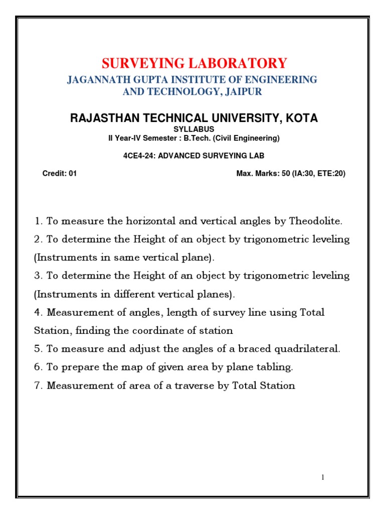 Surveying 1 labmanual_syb_tech Surveying Lab Manual For Diploma In Civil Engineering Thus the plan is plotted. Fieldworks covered in this manual include. department of civil engineering. students will apply the knowledge gained from theoretical surveying to practice. Measurement of distance by ranging and chaining. knowledge on basic survey methods (survey lab i) is essential in order to determine the distance and heights of the objects using. table. Surveying Lab Manual For Diploma In Civil Engineering.